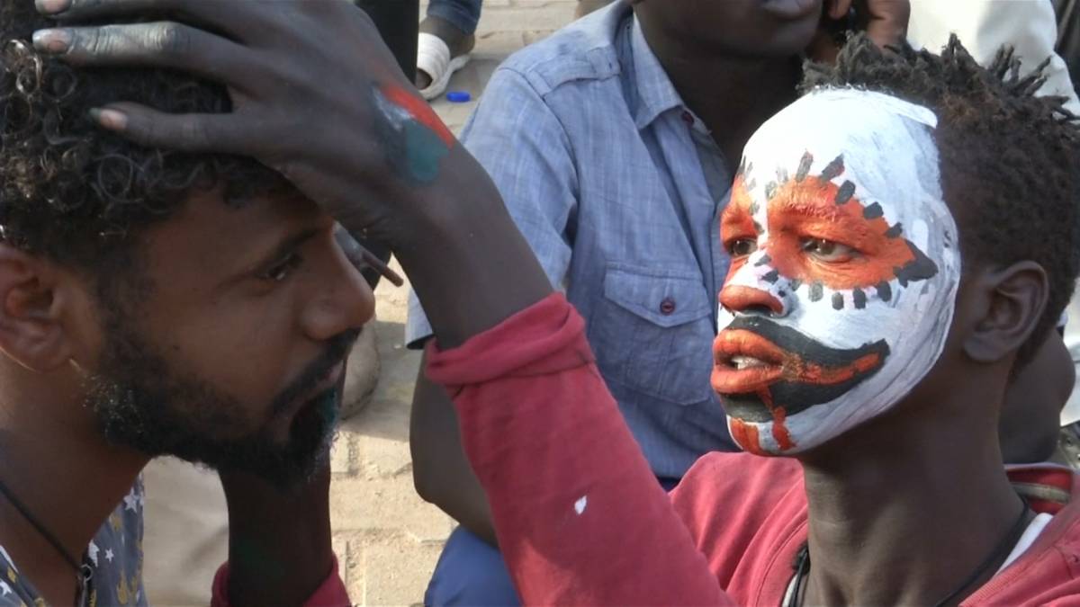 في مظهر مختلف بدأ المحتجون في شوارع العاصمة الخرطوم في رسم علم بلدهم على وجوههم