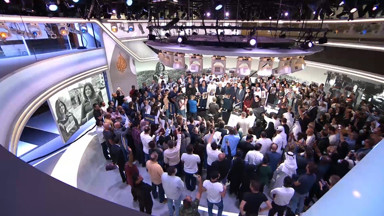 من وقفة نظمتها الشبكة داخل غرفة أخبار قناة الجزيرة في الدوحة تنديا باغتيال الزميلة شيرين (الجزيرة)