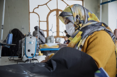 امرأة أفغانية – عادت مؤخراً من إيران – تحضر دورة خياطة في مدرسة تديرها غولزار، سيدة أعمال شابة، خصصتها للنساء المتضررات من الحرمان والوصم.