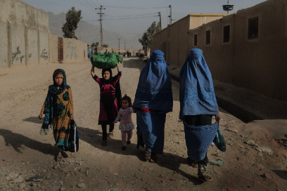 أم وأطفالها يعبرون الشارع في مقاطعة قندهار. وتتعرض قدرة النساء على التنقل بحرية في أفغانستان للتهديد بينما يؤدي الجفاف والاضطرابات في جميع أنحاء البلاد إلى زيادة القيود على التنقل وزيادة التعرض للمضايقات في الأماكن العامة.