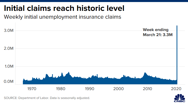 أفادت وزارة العمل الأمريكية إن جائحة فيروس كورونا تسببت في استقبال رقم قياسي تاريخي من الطلبات الأسبوعية للحصول على إعانات البطالة في الولايات المتحدة، بزيادة قدرها ثلاثة ملايين طلب دفعة واحدة وفي أسبوع واحد.