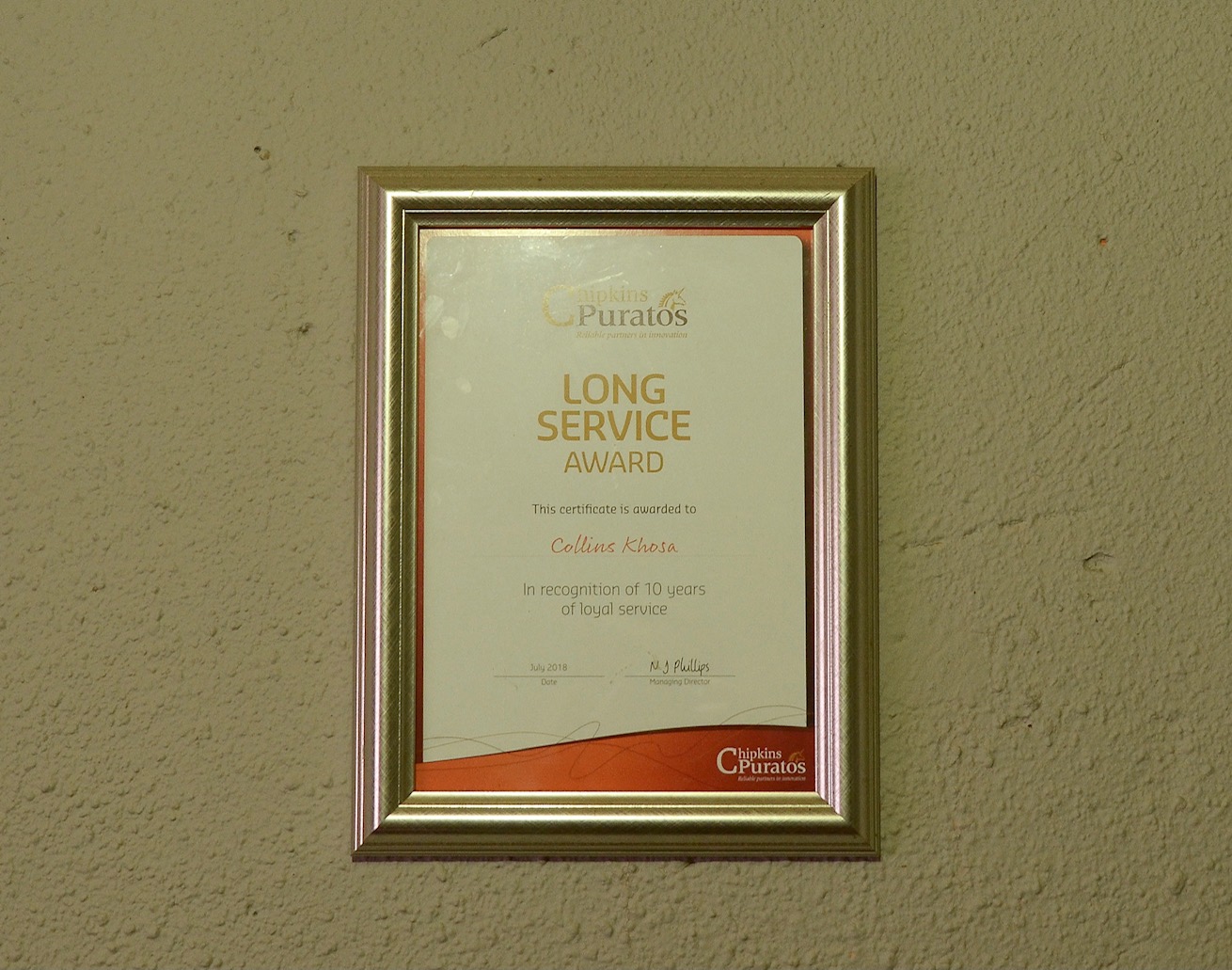 I meet the Khosa family at their house on a late winter afternoon in June. Signs of Collins Khosa still linger in the small house made of brick and zinc. A certificate of good service by the bakery where Collins worked is displayed on the wall.