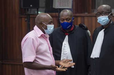 Paul Rusesabagina speaking to his lawyers at the trial in Kigali on 26 February 2021.